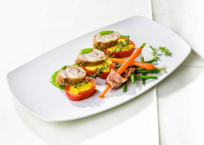 Roulade Toscana ca. 90 min bei 135 °C im Heißluftrohr braten.